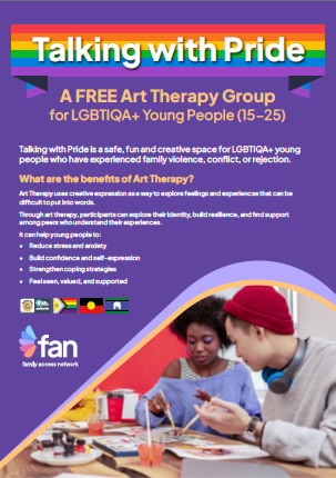 FAN offers a therapeutic support group and individual support for LGBTIQA+ young people aged 15-25 who have experienced family violence.